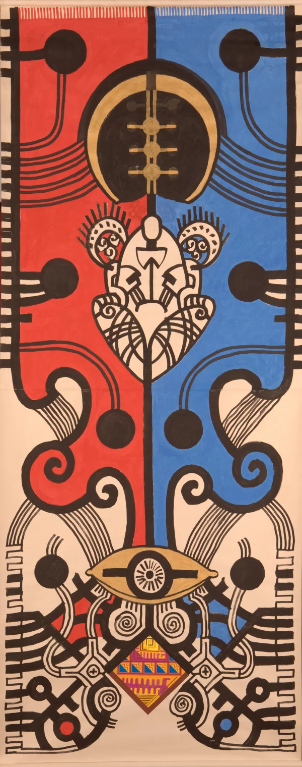 Tribal Art 1995 is work of the student Kien at the Vietnam Fine Arts University in Hanoi that was exhibited in a group show of all the students. A large triptych, composed of three panels 200cm height by 90cm wide, the work as it hung fluttering in the breeze made a very strong impression. Utilizing strong natural colors on paper, the artist used symbols from the different ethnic minorities in the Central Highlands where he would often go, seeking inspiration from their uninhibited way of living with nature. Currently the artist lives as a Buddhist monk at a monastery in central Hanoi.